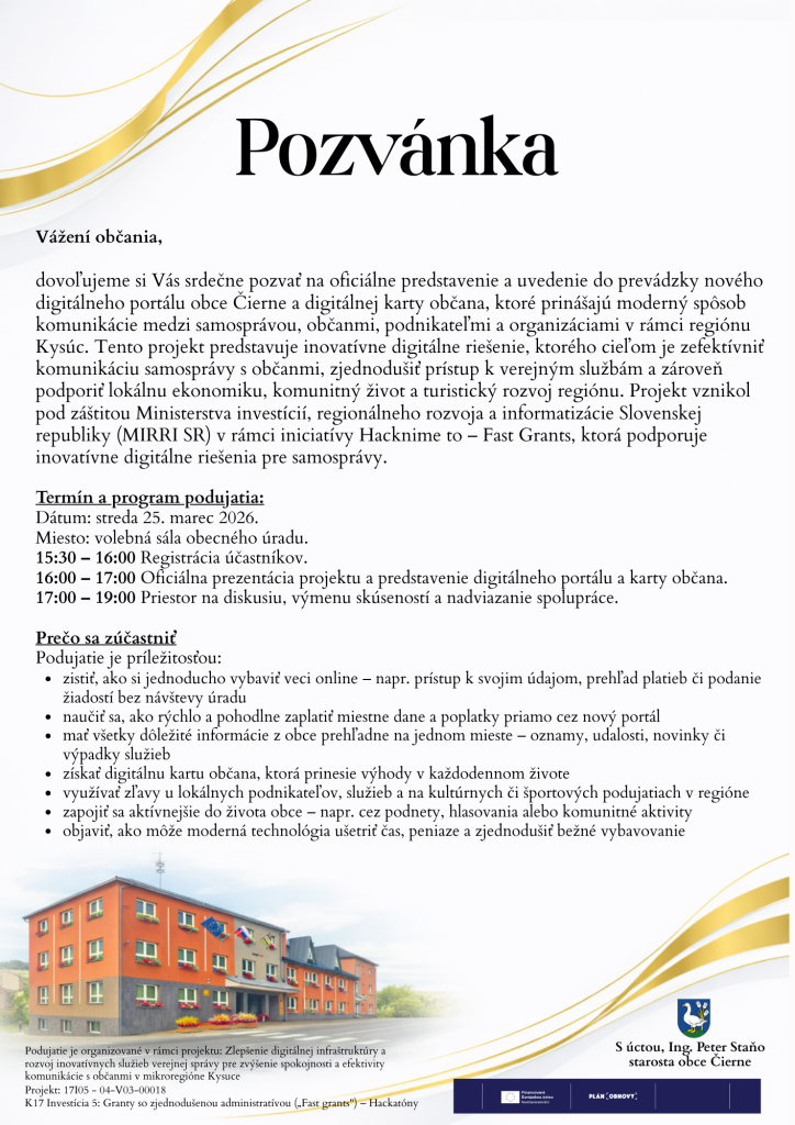 dovoľujeme si Vás srdečne pozvať na oficiálne predstavenie a uvedenie do prevádzky nového digitálneho portálu obce Čierne a digitálnej karty občana, ktoré prinášajú moderný spôsob komunikácie medzi samosprávou, občanmi, podnikateľmi a organizáciami v rámci regiónu Kysúc. Tento projekt predstavuje inovatívne digitálne riešenie, ktorého cieľom je zefektívniť komunikáciu samosprávy s občanmi, zjednodušiť prístup k verejným službám a zároveň podporiť lokálnu ekonomiku, komunitný život a turistický rozvoj regiónu. Projekt vznikol pod záštitou Ministerstva investícií, regionálneho rozvoja a informatizácie Slovenskej republiky (MIRRI SR) v rámci iniciatívy Hacknime to – Fast Grants, ktorá podporuje inovatívne digitálne riešenia pre samosprávy.